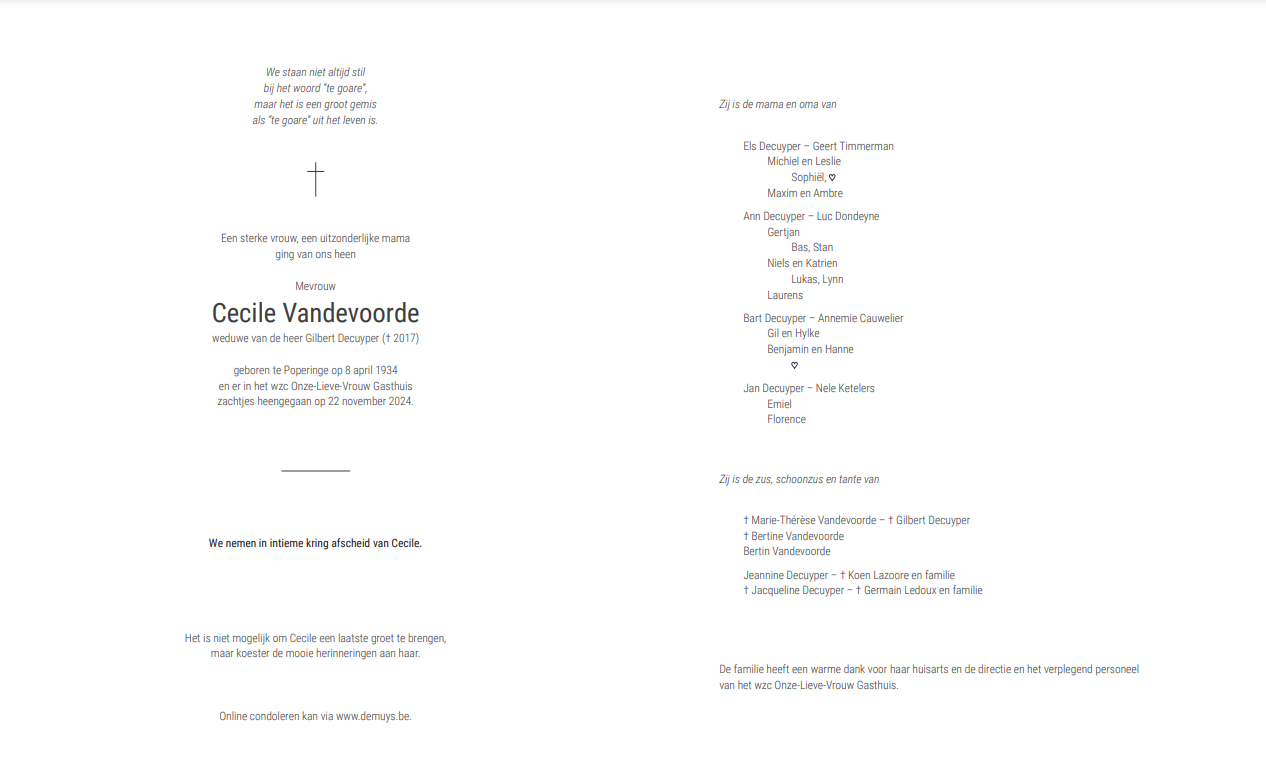 Met droefheid melden wij het overlijden van Cecile Vandevoorde, weduwe van Gilbert Decuyper († 2017).